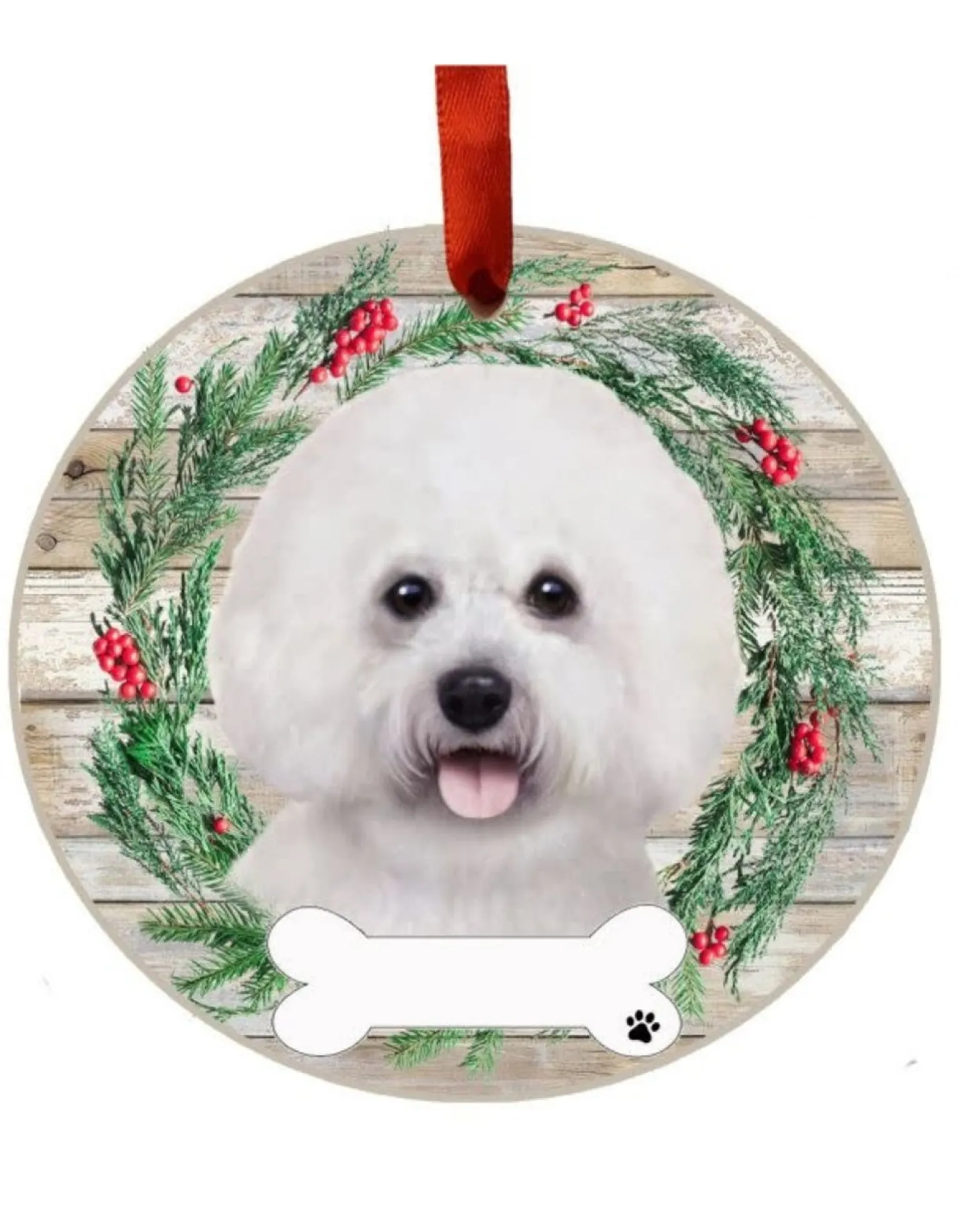 This Christmas Ornament Features An Adorable Picture Of A Bichon Frise Inside A Wreath Design, With A Bone-Shaped Tag That Allows You To Personalize It With Your Pet’s Name. Made Of High-Quality Ceramic, This Ornament Has A Smooth Finish And Is Easy To Hang On Your Tree Or Display In Your Home. The Perfect Gift For Any Pet Lover, Or For Adding A Personalized Touch To Your Own Holiday Decor.