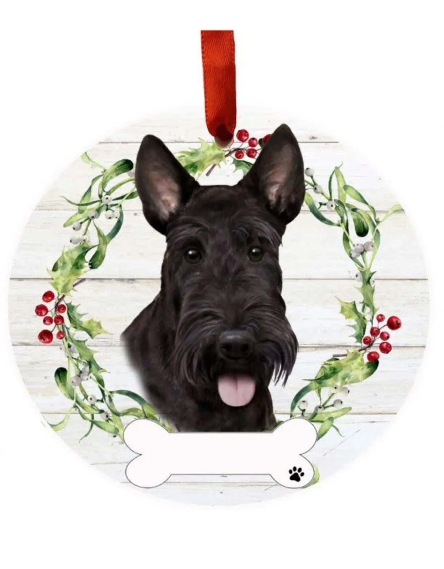 This Christmas Ornament Features An Adorable Picture Of A Scottish Terrier Inside A Wreath Design, With A Bone-Shaped Tag That Allows You To Personalize It With Your Pet’s Name. Made Of High-Quality Ceramic, This Ornament Has A Smooth Finish And Is Easy To Hang On Your Tree Or Display In Your Home. The Perfect Gift For Any Pet Lover, Or For Adding A Personalized Touch To Your Own Holiday Decor.