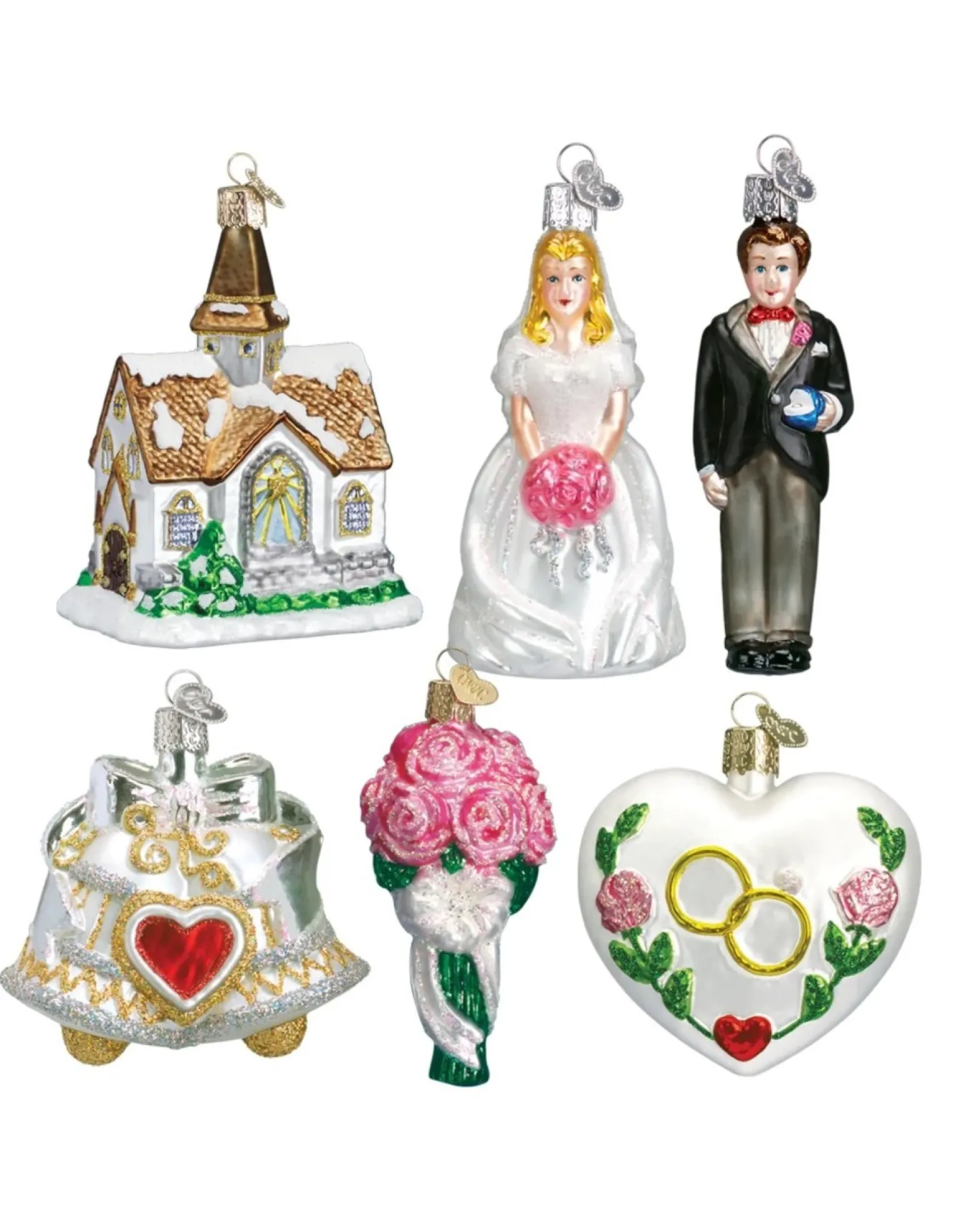 This Delightful Wedding Collection Includes Six Beautiful Blown-Glass Ornaments, Each Hand-Painted & Glittered By Artisans. Each Collection Comes Packaged In A Keepsake Box, Including A Certificate Of Remembrance To Document The Wedding Day. The Set Includes: Wedding Bells, Rose Bouquet, Wedding Heart, Bride, Wedding Chapel And Groom. The Wedding Collection Makes A Wonderful Present & A Cherished Memento.